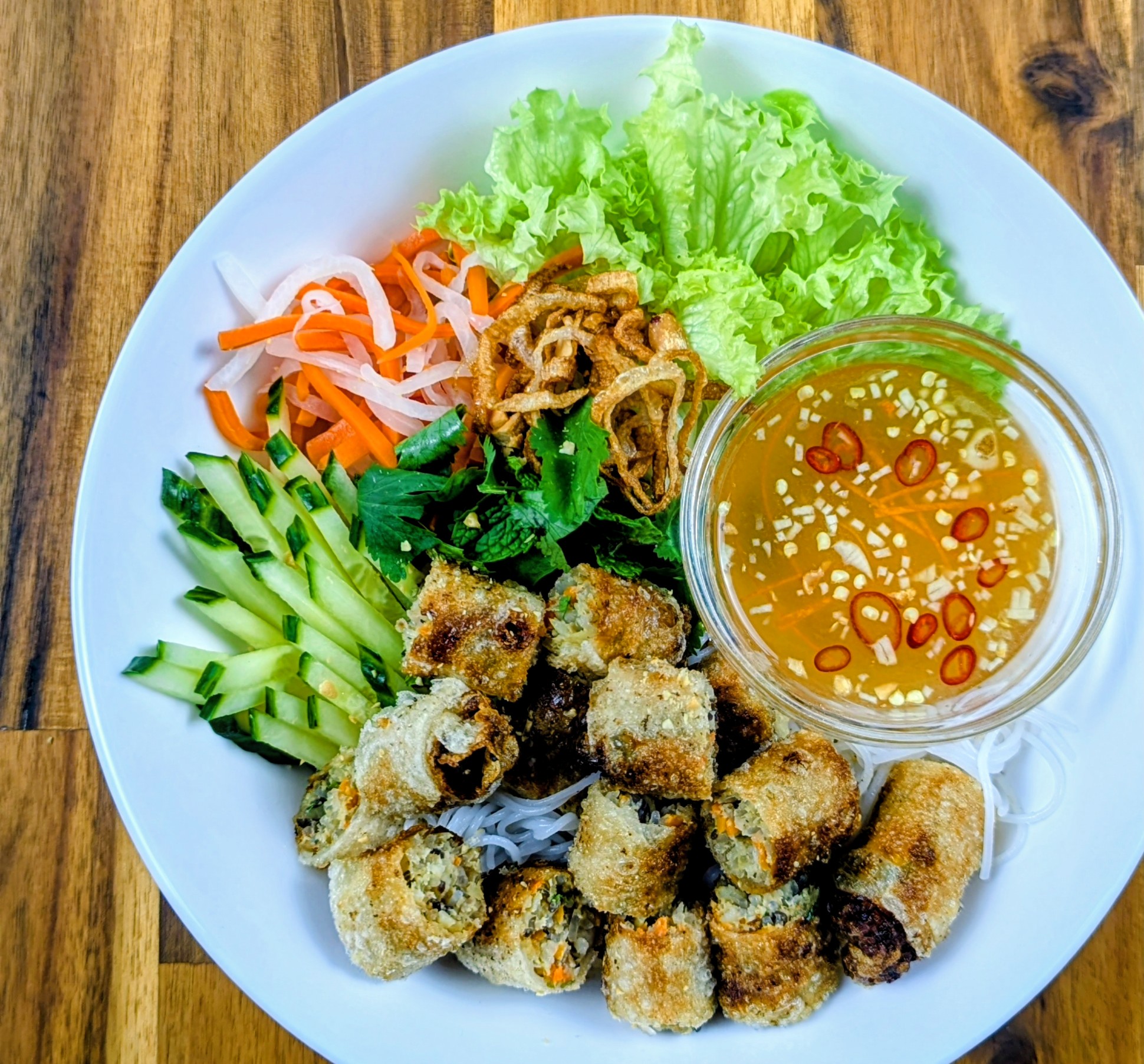 Pork, Shrimp & Veggie (or veggie) Spring Roll Noodle Bowls, Đồ chua (pickled carrot & daikon), Nước Chấm (Vietnamese dipping sauce), and Crispy Shallots. Dishes to be finalized upon booking.